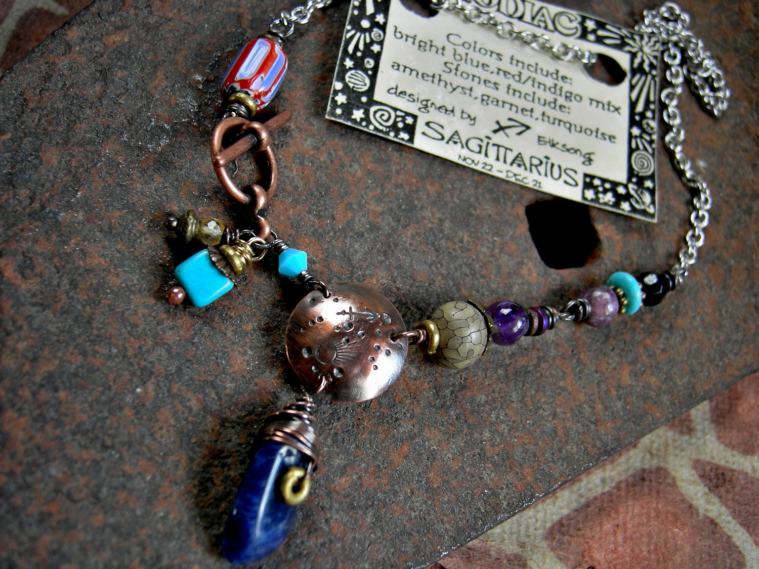 A short length, strung bead style necklace with turquoise, coral, black lava stone & hand fabricated, "confetti" focal of sterling & turquoise.