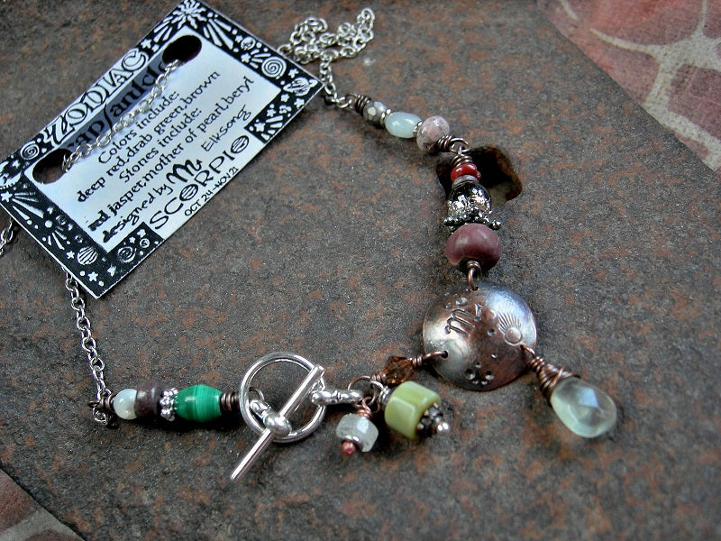 Custom necklace with oxidized sterling wire wrap dragon, vintage German glass cabochon & red gemstone beads.