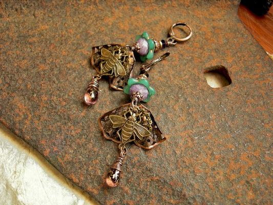 Bees in the Lavender Earrings, Art Nouveau Style, Purple, Green