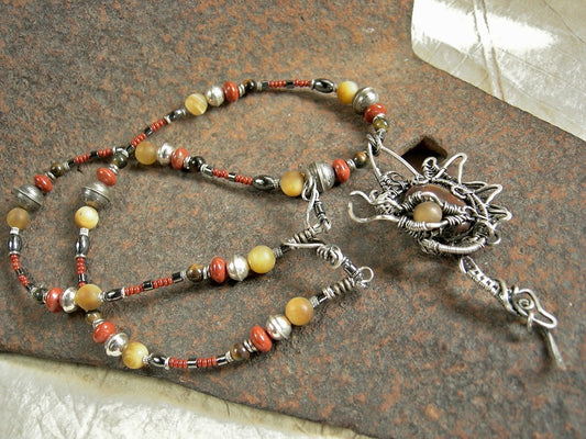 Silver Dragon Necklace, Sterling Wire Wrap, Red & Gold Gemstone