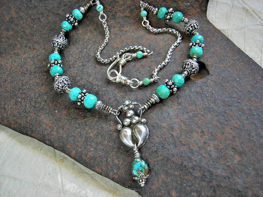 Silver Goddess Necklace, Ornate Silver Beads, Faceted Turquoise