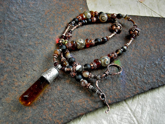 Sun Temple Necklace, Amber, Copper, Smoky Quartz, Agate