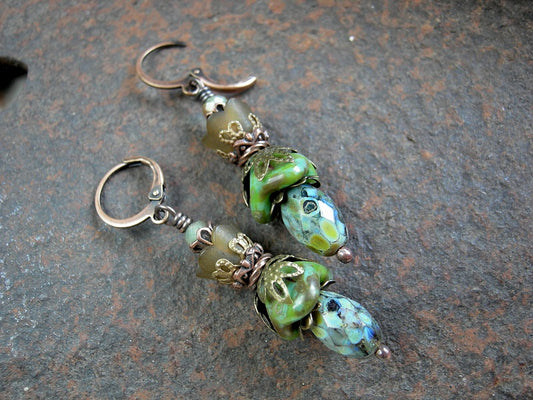 Woodland Flower Earrings, Brown & Green Glass Drops