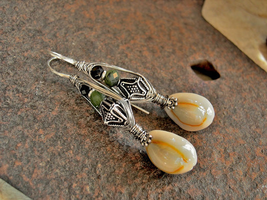 Cowrie Shell Wrapped Hook Earrings, Sterling, Jade, Black Tourmaline