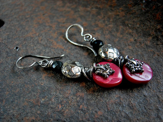 Dramatic Red Coral & Obsidian Earrings, Sterling Wire Wrap