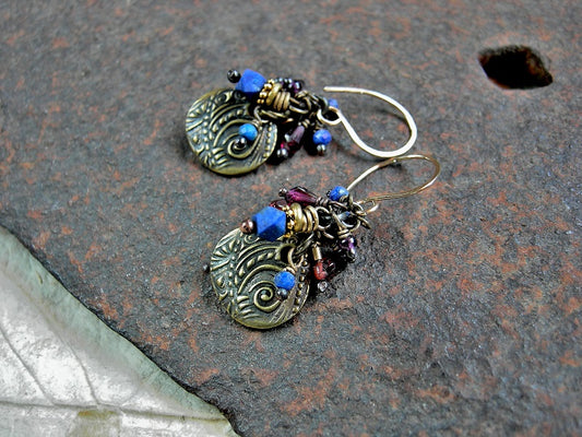 Lapis & Garnet Earrings, Cluster Style, Queen's Garden