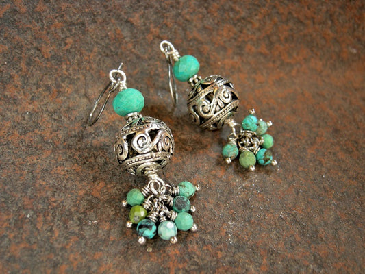 Turquoise & Silver Filigree Earrings, Faceted Gemstone Clusters