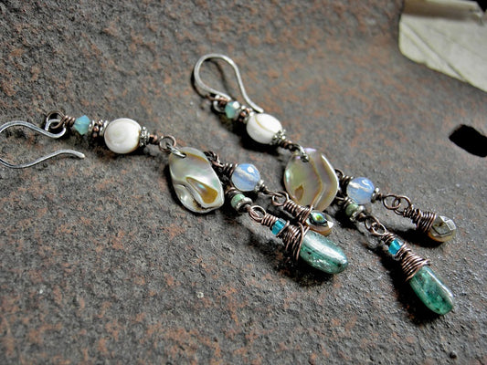 Mermaid Swag Earrings, Long Clusters, Abalone, Apatite, Opalite