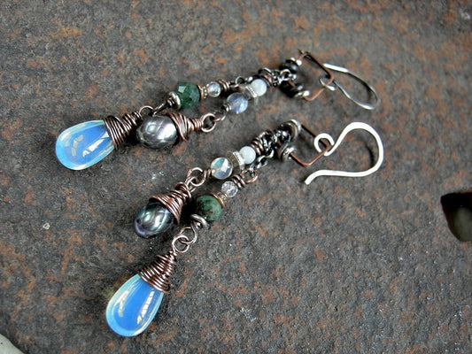 Opal Light Earrings, Copper Wire Wrap, Opalite Teardrops, Vintage Pearls