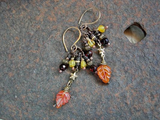 Candy Cluster Earrings, Butterscotch Amber, Carnelian, Gold Stars