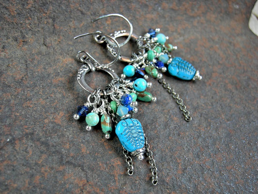 Deep Sea Trilobite Earrings, Cluster Style, Lapis & Turquoise