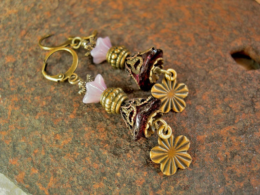 Violet Blossom Earrings, Antiqued Brass, Glass Flowers, Crystal Beads