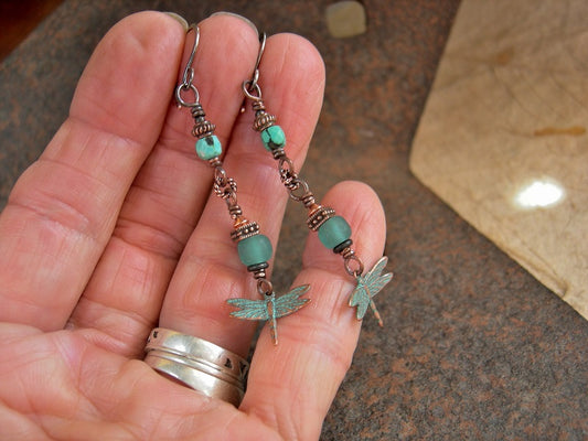 Spring Sky Earrings, Copper Verdigris Dragonflies, Faceted Turquoise