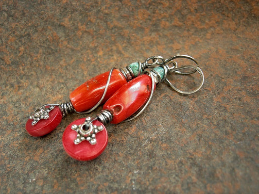 Rich Red Coral Earrings, Sterling Wire Wrap, Touch of Turquoise