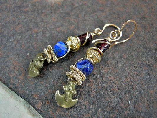 Decadent Lapis, Garnet & Gold Earrings, Vintage Ethnic Brass