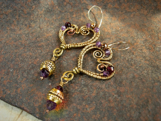 Heart O Gold Brass Wire Wrap Earrings, Faceted Amethyst & Garnet