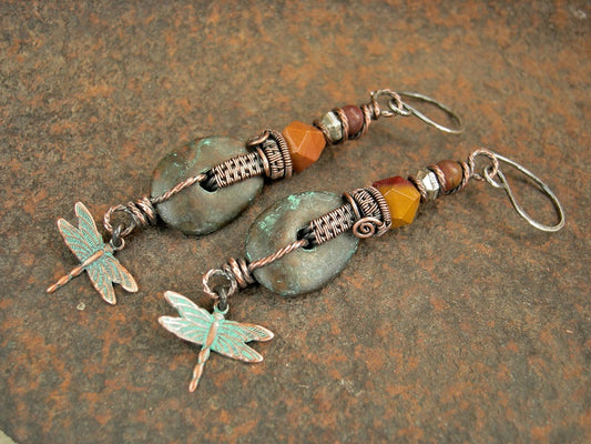 Dragonflies in the Desert Earrings, Copper Wire Wrap, Mykonos Ceramic