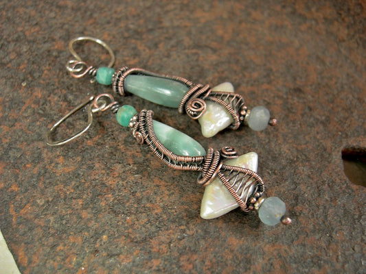 Oceana Earrings, Diamond Shaped Pearls, Green Moonstone, Copper Wire Wrap