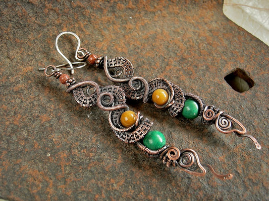 Dragon Tail Earrings, Copper Wire Wrap, Gold & Green Gemstone