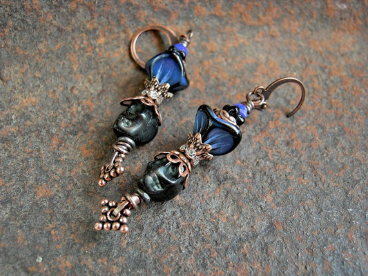 Blue on Black Sugar Skull Earrings, Magnesite, Glass Flowers, Copper