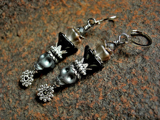 Night Queen Sugar Skull Earrings, Glass Flowers, Black, Silver & Gray