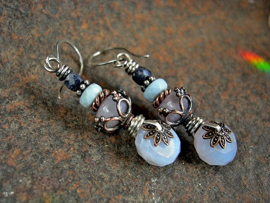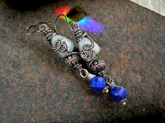 Copper Coils Earrings, Aquamarine, Lapis, Ornate Copper Beads