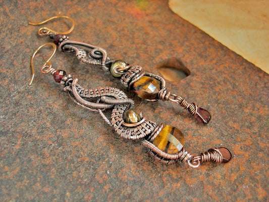 Mellow Fall Color Earrings, Copper Wire Wrap, Tigereye, Garnet