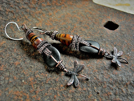 Touch Earth, Long Drop Earrings, Copper Dragonflies, Black & Brown