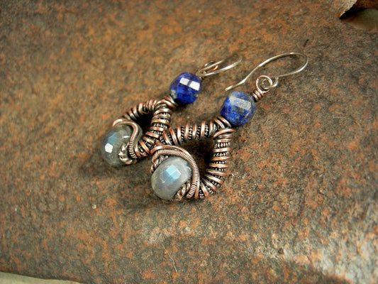 Iridescent Blue Earrings, Faceted Labradorite & Lapis, Copper Wire Wrap