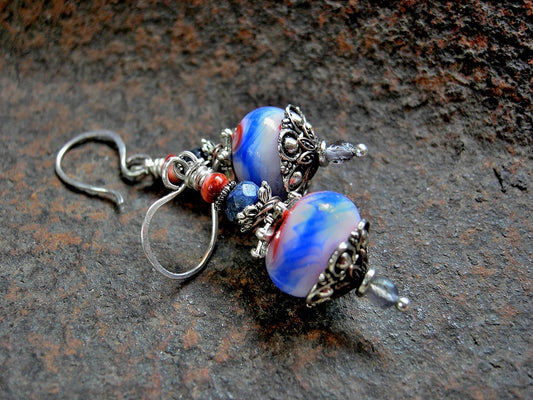 Art Bead Earrings, Handmade Lampwork Glass, Lapis & Spiny Oyster