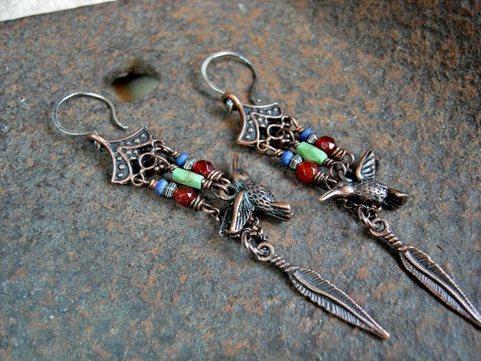 Autumn Hummingbird Earrings, Colorful Gemstone & Copper