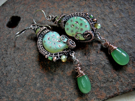 Forest Pool Earrings, Verdigris Dragonfly, Copper Leaves, Chrysoprase