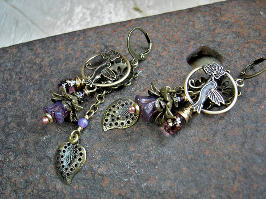 Hummingbirds in Lilac Chandelier Earrings, Antiqued Brass & Glass