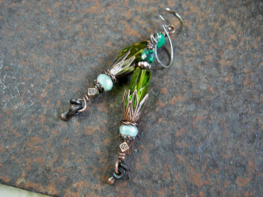 Sea Green Vintage Glass & Gemstone Earrings, Bead Stack Style