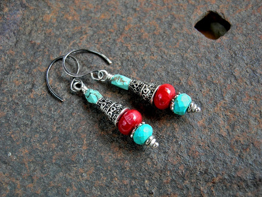 Simple Gemstone Drop Earrings, Coral, Natural Turquoise & Silver