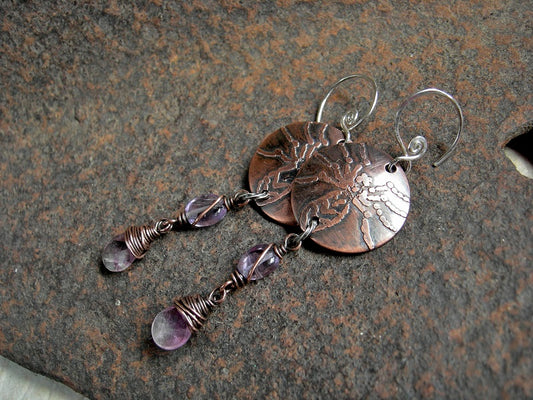 Orb Weaver Earrings, Etched Copper Spider Designs, Amethyst, Fluorite