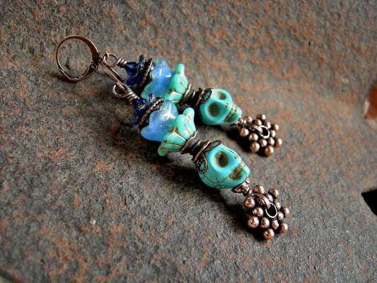 Turquoise Flower Sugar Skull Earrings, Shades of Blue & Copper