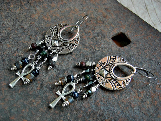Dark Ankh Earrings, Black & Brown Gemstone Chandeliers