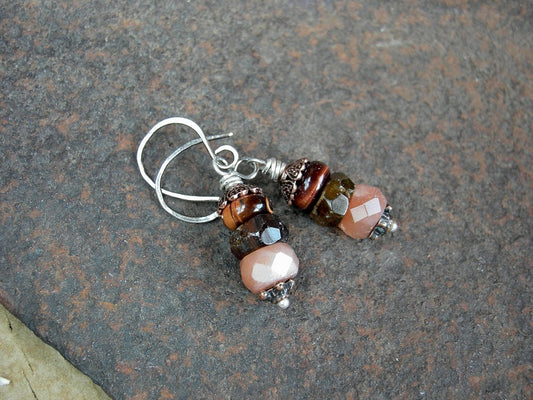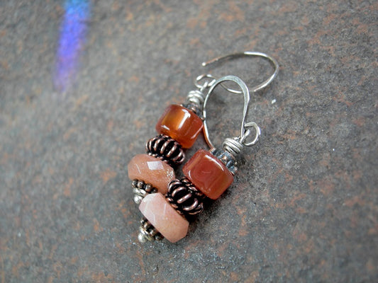 Rich, Warm Color Gem Stack Earrings, Sunstone, Hessonite, Tiger Eye