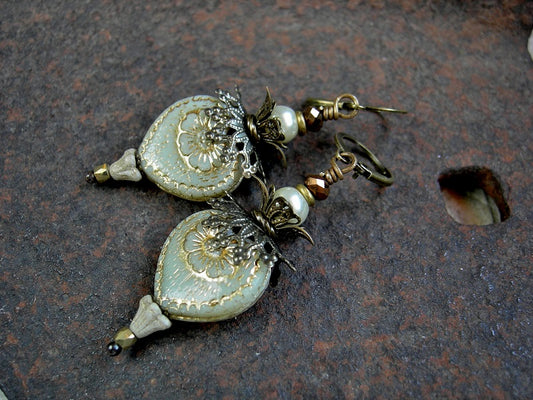 Romantic White Heart Earrings, Victorian Wedding, Brass Filigree