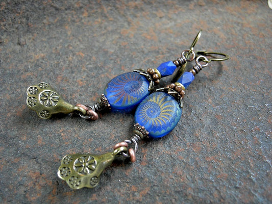 Deep Blue Sea Earrings, Glass Nautilus Beads, Faceted Lapis, Gold Scallop Drops