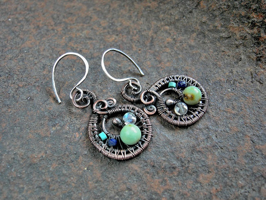 Blue Bubbles Earrings, Copper Wire Wrap Spirals, Blue Gemstone Beads