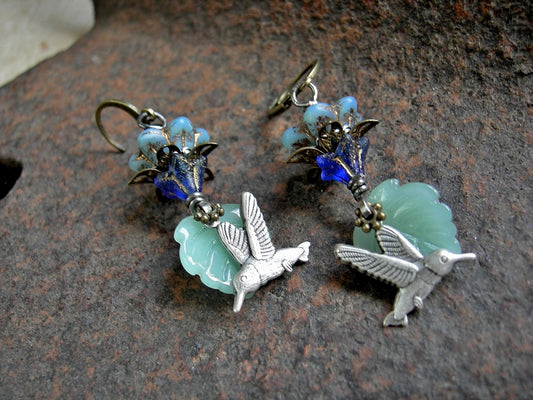 Silver Hummingbird & Flower Earrings, Blue Morning, Nature Inspired