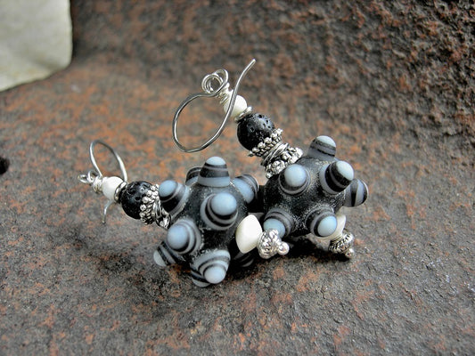 Basic Black Earrings, Ornate Lampwork Glass Beads, Bone, Lava Stone