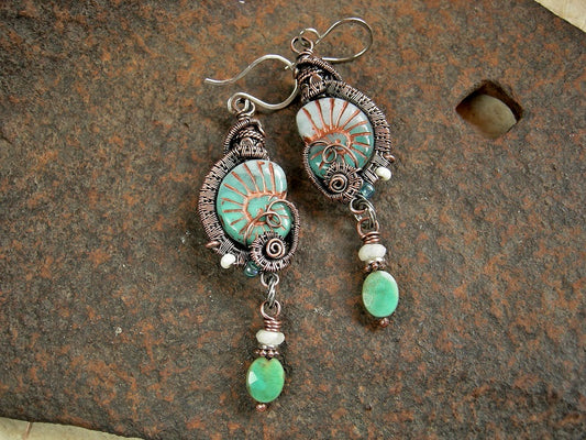 Queen of the Sea Earrings, Aqua Nautilus Beads & Copper Wire Wrap