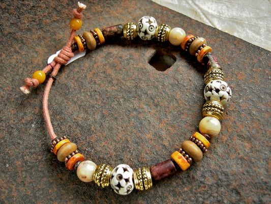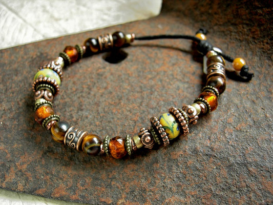 Adjustable Slider Bracelet, Warm Sun Colors, African Glass, Tiger Eye