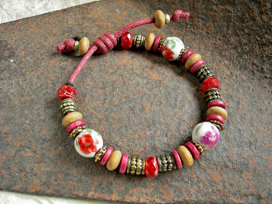 Fire Flower Adjustable Slider Bracelet, Vintage Porcelain, Red Glass