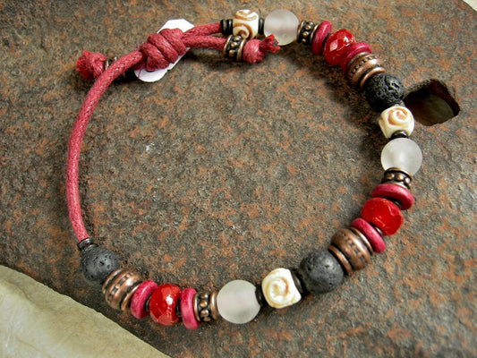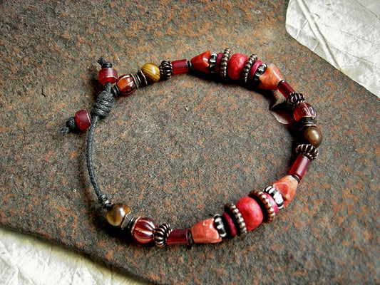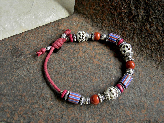 Fire Walk Adjustable Slider Bracelet, African Glass, Mexican Red Onyx
