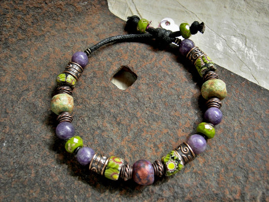 Jungle Bloom Sliding Knot Bracelet, Antique Venetian Glass, Purple Stone