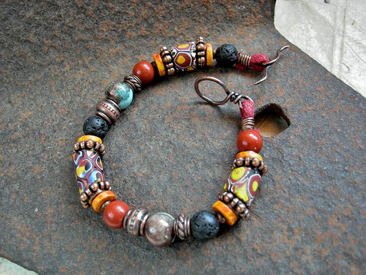 African Sun Bracelet, Antique Red & Yellow Venetian Glass, Copper